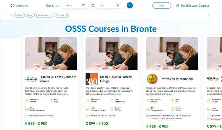 1. School Marketplace: This section enables students to explore various courses offered by different schools listed on Corsidia. Users can view course details, browse through pages, and use search filters to refine their options. Additionally, students can utilize geolocation features to find schools or courses in specific areas and raise inquiries directly with school administrators.